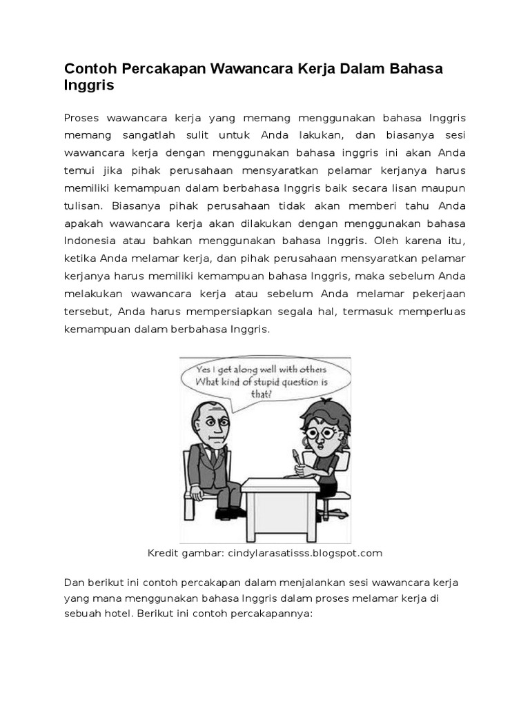 Contoh percakapan wawancara dalam bahasa inggris ini dialami oleh sinta lulusan universitas negeri dibandung jurusan managemen perhotelan yang melamar perkerjaan di sebuah hotel. Percakapan dalam bahasa inggris di telepon menentukan. Nterview bahasa inggris hotel : Walaupun terkesan sederhana, banyak orang gagal. Nterview bahasa inggris hotel :
